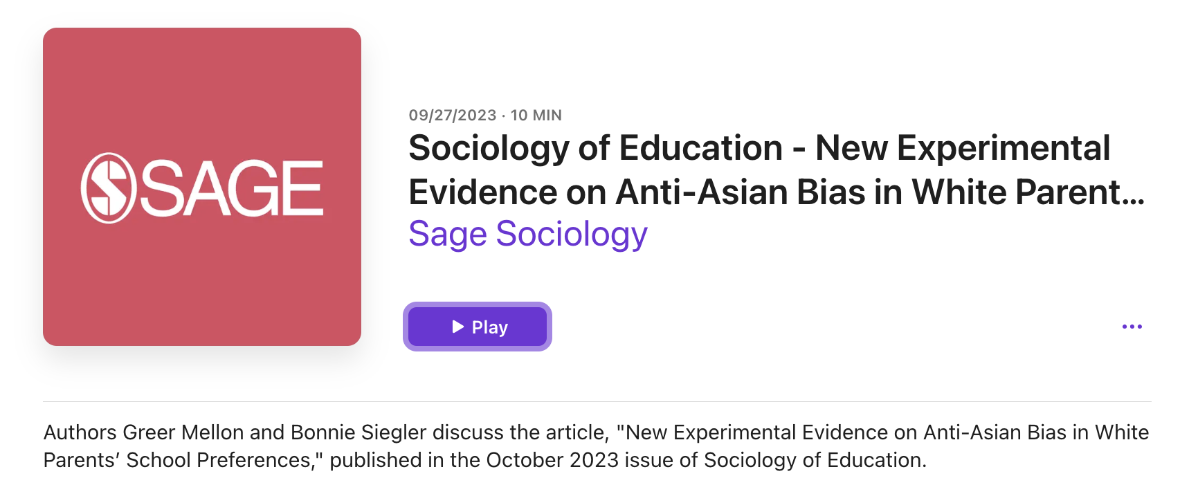 SAGE Sociology Podcast – “New Evidence on Anti-Asian Bias in White Parents School Preferences” : We discuss key findings from our article “New Experimental Evidence on Anti-Asian Bias in Parents’ School Preferences”, published in Sociology of Education, on the SAGE Sociology podcast. Listen to the recording here: https://podcasts.apple.com/us/podcast/sociology-of-education-new-experimental-evidence-on/id871126157?i=1000629443700