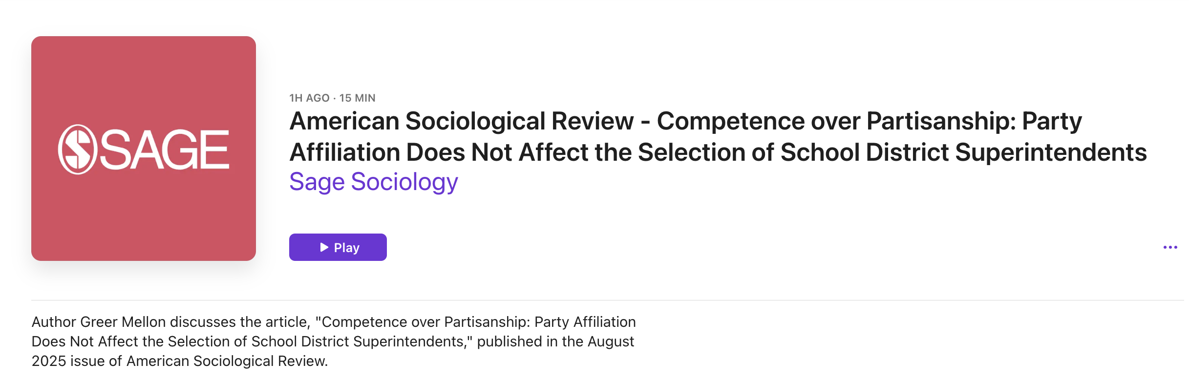 SAGE Sociology Podcast – “Competence over Partisanship: Party Affiliation Does Not Affect the Selection of School District Superintendents” : I discuss key findings from my article “Competence over Partisanship: Party Affiliation Does Not Affect the Selection of School District Superintendents”, published in American Sociological Review, on the SAGE Sociology podcast. Listen to the recording here: https://podcasts.apple.com/us/podcast/american-sociological-review-competence-over-partisanship/id871126157?i=1000718342811